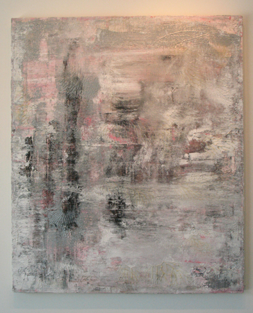 Hausmann’s silvery paintings are unique – and reminiscent of lichen on rocks if you happened upon them during a full moonlit night. Depending on time of day or the lighting, these highly reflective works will change in hue. The mutations toward either blues or pinks are startling even in their subtlety.