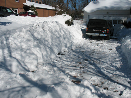 Update from Snowmageddon. After two days, most of the driveway is shoveled. At this point, I’m hoping one of the neighbors will come over with a snowplow….but at least there’s not much left. That’s if my back will hold up. They say another snow coming in on Tuesday, which is about when I’ll have gotten the truck out for the first time.Â