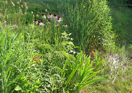Last year we had a problem with predatory wasps because E herbicided my hill where I had put down thick layers of newspapers & straw in an effort to reduce erosion and water running down into the basement. Bare ground is the wasps’ favorite habitat. This season he’s resisted spraying and I have some nice new ground cover. (behind the purple Echinacea)