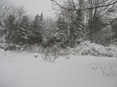 I went to bed with snow coming down and woke up to the same weather. Stumbling out the front door, the snow was up to my knees. No NY Times out front, and I can’t get out the back door because the drifts have me snowed in. The wind picked up this morning and it now looks like a full blizzard out there. I haven’t seen this much snow since I left Nova Scotia decades ago.